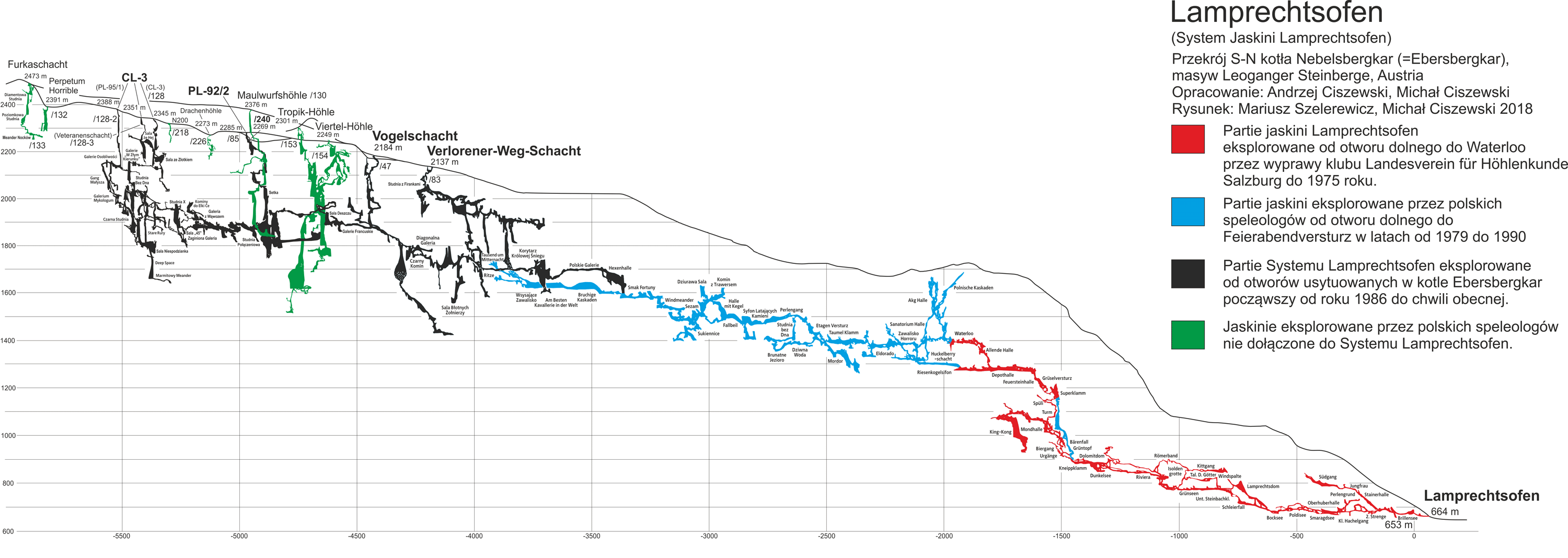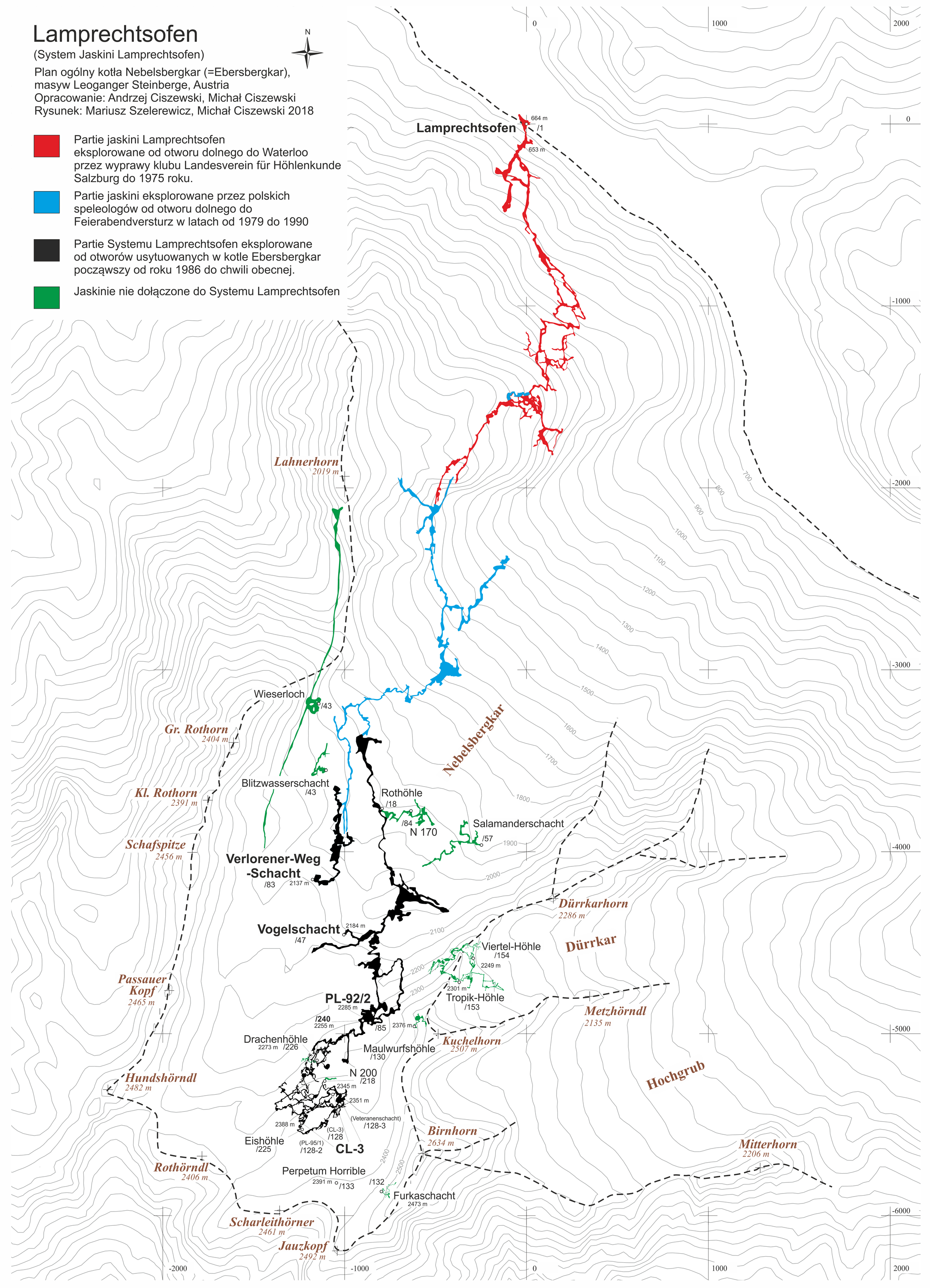 W ubiegłym roku w wyniku naszej działalności w Leogangu w CL3, którą łączymy z Lampo, w partiach kierujących się we właściwym kierunku zamknęliśmy wszystkie ewidentne przodki. Od strony Lampo czyli w PL2 dotarliśmy z poręczowaniem i pomiarami do biwaku z którego mogliśmy dojść w rejon możliwych połączeń z CL3. W jaskini Smoczej ładnie puszczało, dotarliśmy jakieś 200 m nad partie w CL3, ale do PL2 z tego miejsca jest jeszcze daleko. Jej położenie dało nam jednak nadzieję na znalezienie ciągów, które z innego kierunku doprowadzą nas do Lampo. Na razie jaskinia pokręciła mocno i nie doszliśmy do żadnych ciągów horyzontalnych. Najwyżej położona, jaskinia Furkaschacht, zalodziła się kilka lat temu i pomimo naszych starań nie chciała nas wpuścić do środka. Kolejne przodki mieliśmy w Weteranen schacht, w którym niezbyt głęboko trafiliśmy na ciągi, które zmierzają w kierunku Furkaschacht i choć odległość jest spora, to problem jest perspektywiczny.